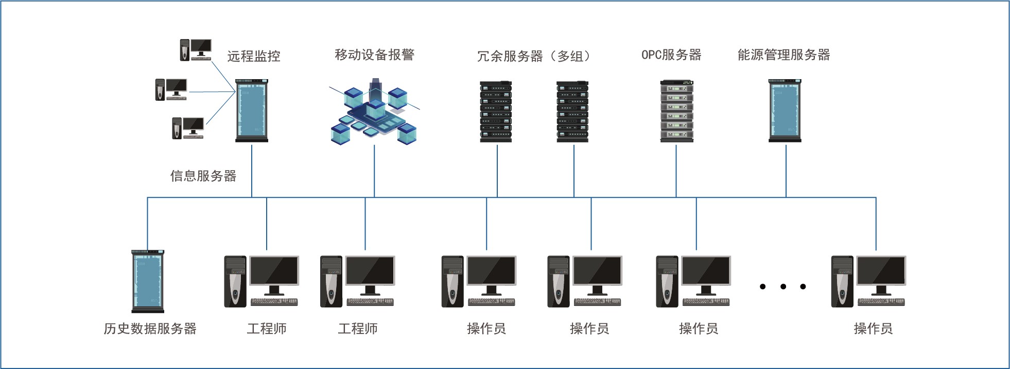 FMCS系統,擁有冗余服務器,以確保收集的數據實時無丟失。歷史記錄和報警信息都有專用的服務器來保存數據,以完善的架構來保證每個環節的數據能可靠的處理,從而保證系統能穩定可靠的運行。