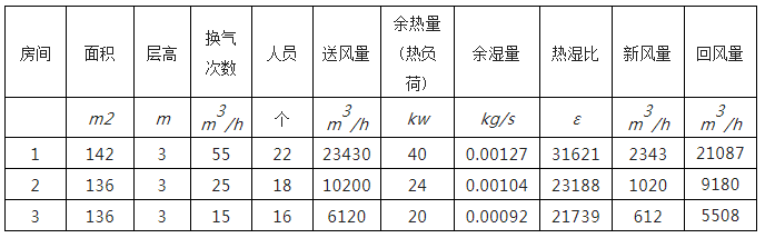風量負荷計算見下表:熱濕比的定義為空氣的焓變化和濕量變化之比 ε=Q/W Q為室內計算的熱負荷 W為室內計算是濕負荷