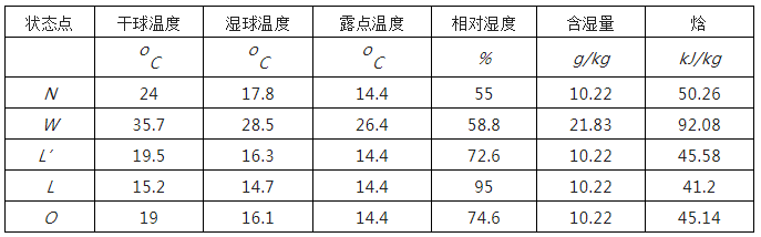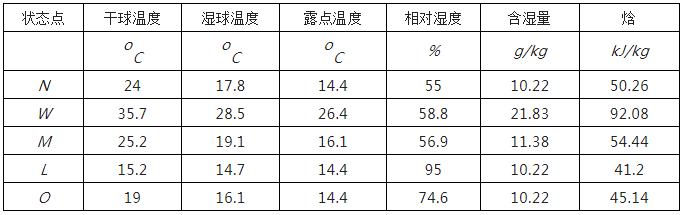 即可求出送風狀態點的焓值io =45.14 kJ/kg,過io作等焓線與熱濕比線(對于高熱型電子廠房,室內散濕量極少,主要散濕源為人體散濕,熱濕比線近似于垂直,所以對回風的處理不能是除濕過程)的交點即可得送風狀態點O。L點:連接室內點N與送風狀態點O,并延長與95%等相對濕度線相交,即得L點。M點:根據新回風混合,混合比等于新回風之反比,即NM/MW=新風量/回風量,即得M點。各狀點參數見下表: